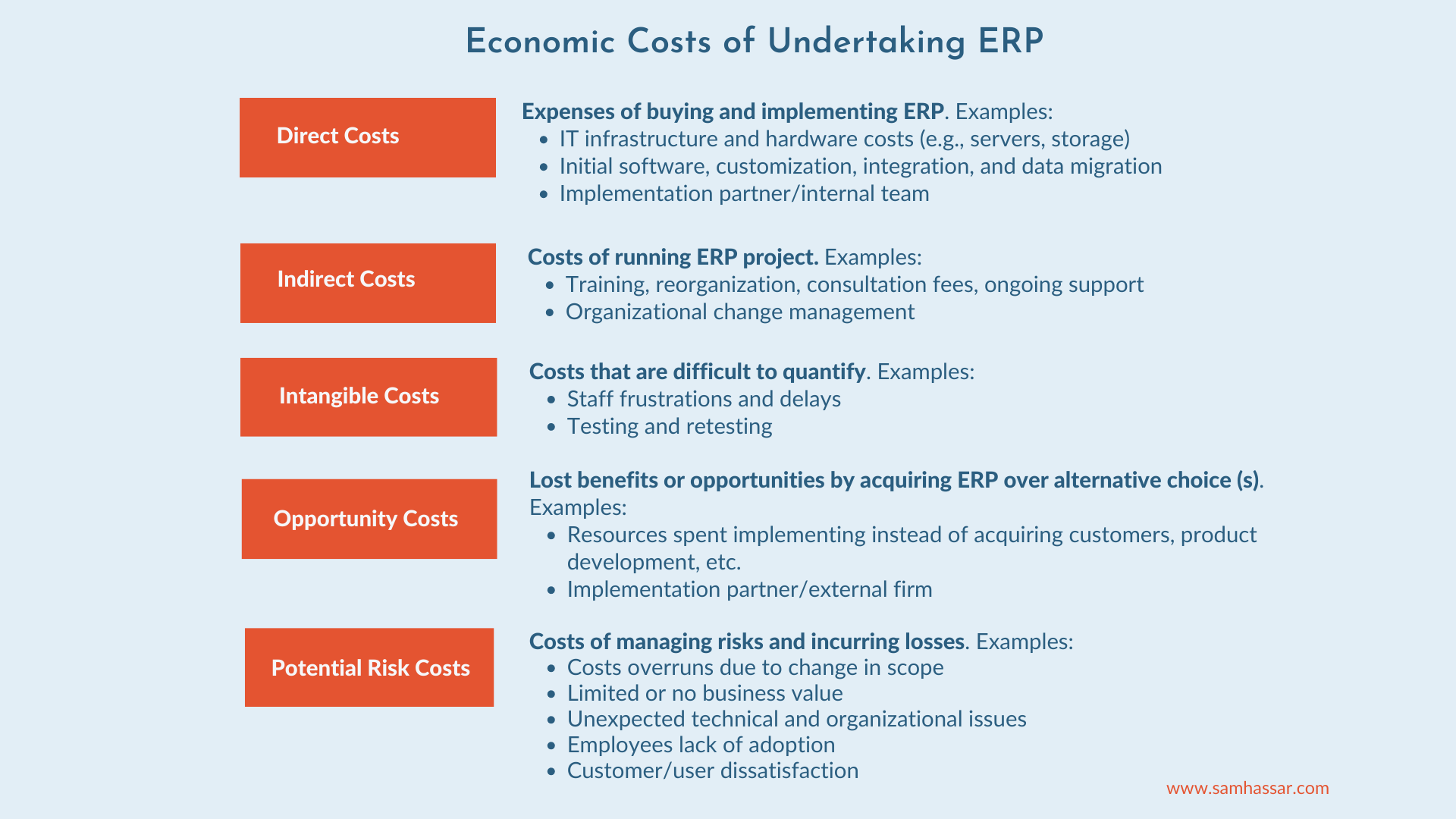 This means considering the costs of undertaking ERP beyond the immediate expenses incurred from the purchase. Consider all potential costs - Direct Costs, Indirect Costs, Intangible Costs, Opportunity Costs, and Potential Risks Cots (see figure below)